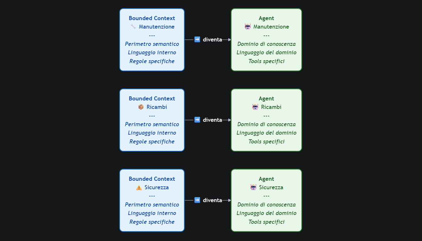 La mappa dei bounded context diventa così la mappa degli agenti — favorendo la specializzazione (es. un agente per la "manutenzione", uno per i "ricambi") rispetto alla generalizzazione, e migliorando la precisione delle risposte.
