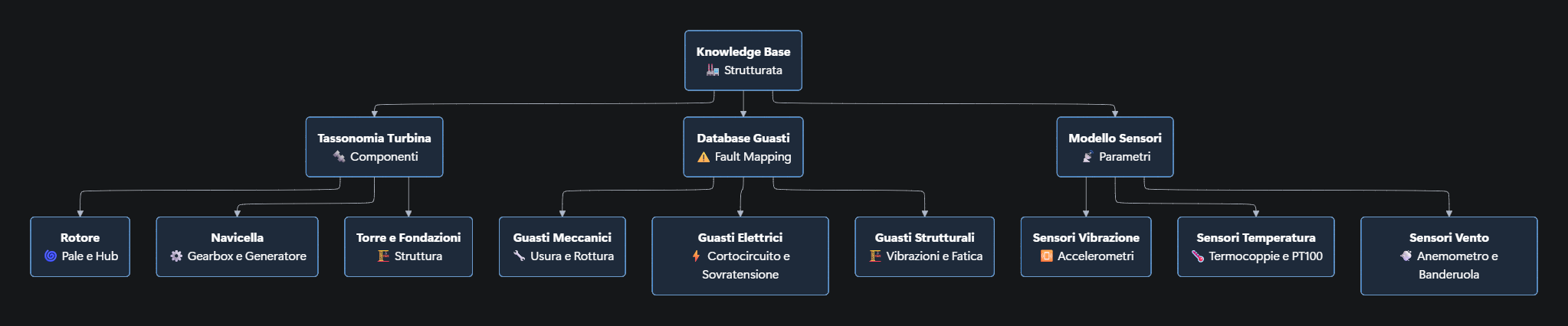 Un approccio Domain-Driven AI, invece, parte dalla costruzione di una knowledge base strutturata: una tassonomia completa delle componenti di una turbina, con ogni elemento collegato ai relativi codici di ricambio; un database in cui le tipologie di guasto sono mappate alle cause probabili e alle procedure correttive; un modello relazionale che lega i parametri dei sensori — temperatura, vibrazioni, pressione — agli stati operativi della macchina.