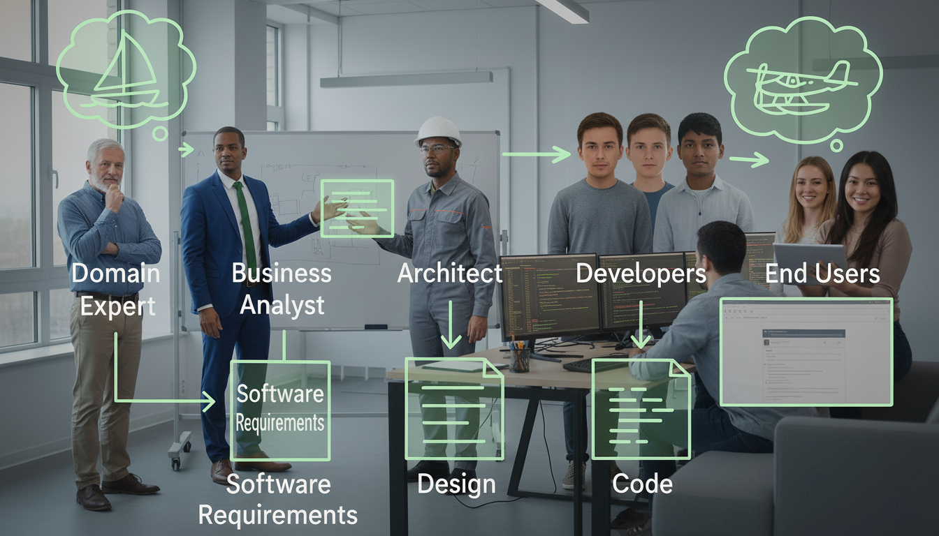Nel mondo dello sviluppo di sistemi AI, la stessa frattura esiste, ed è molto più costosa. Quando un progetto manca di un linguaggio condiviso, ogni figura professionale traduce per le altre: gli sviluppatori interpretano i requisiti degli esperti di dominio, questi ultimi cercano di decodificare il linguaggio tecnico, e nel mezzo si perdono sfumature, vincoli, significati.