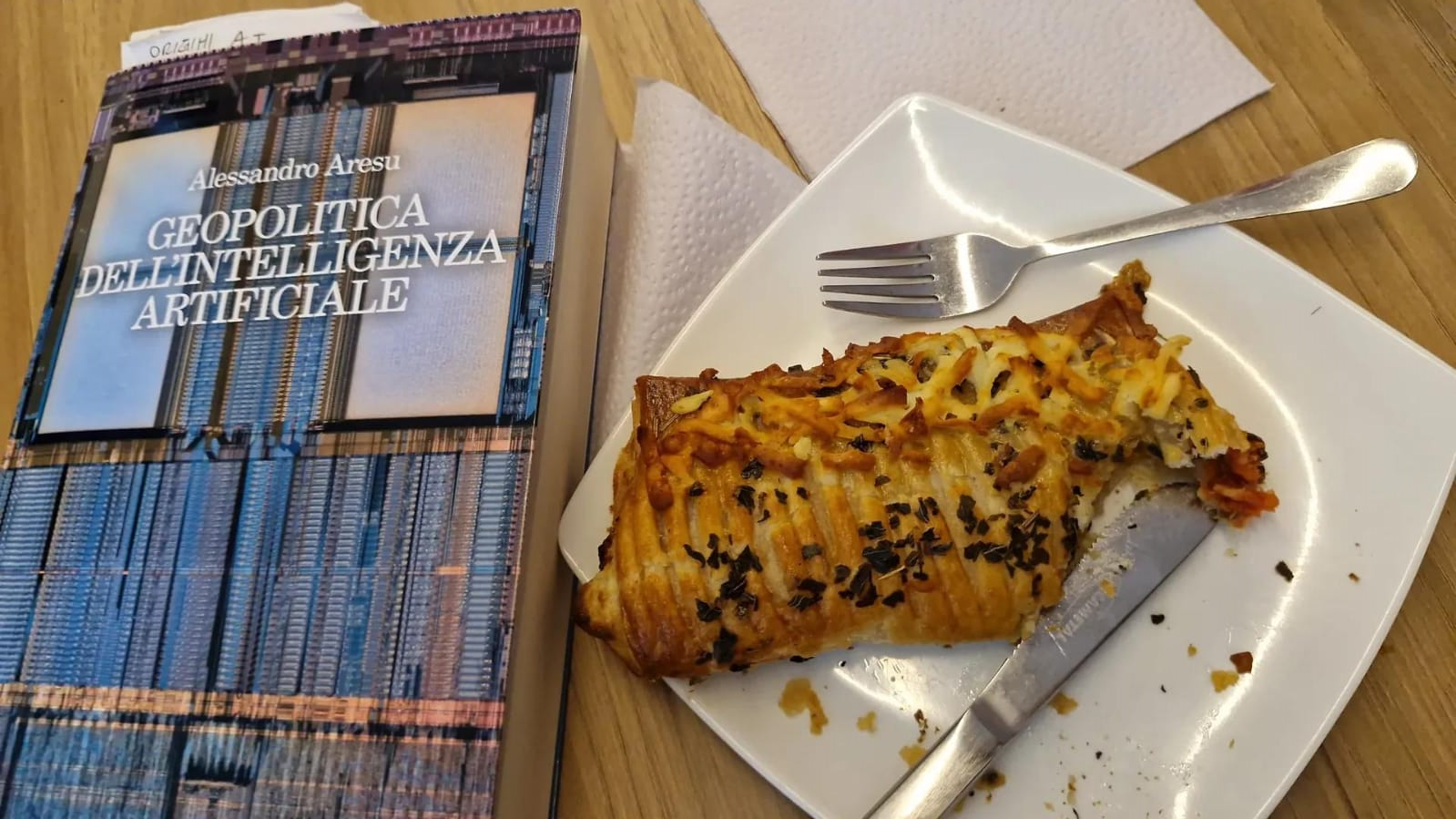 Era la primera vez que participaba en un evento de este tipo y, al llegar con cierto adelanto por la tarde — alrededor de las 16:00 — aproveché para detenerme en el centro comercial Oviedo, cerca de la universidad, donde me permití un palito de queso. Junto con este tentempié estaba leyendo “Geopolítica de la inteligencia artificial” de Alessandro Aresu, un ensayo que analiza cómo la IA está redefiniendo los equilibrios políticos, económicos y estratégicos globales, con especial atención a los desafíos de la gobernanza y al papel de las grandes potencias.