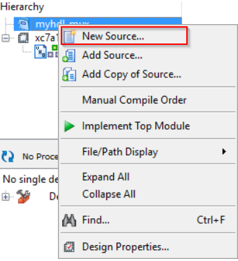 Appena abbiamo creato il nuovo progetto “myhdl_mux” selezioniamo Add Source (1) in modo da importare i 2 files che abbiamo creato precedentemente durante la compilazione in Python che si trovan0 nella cartella di default del progetto.